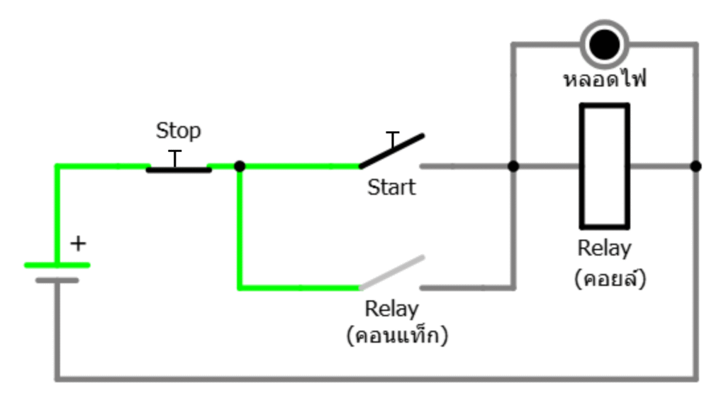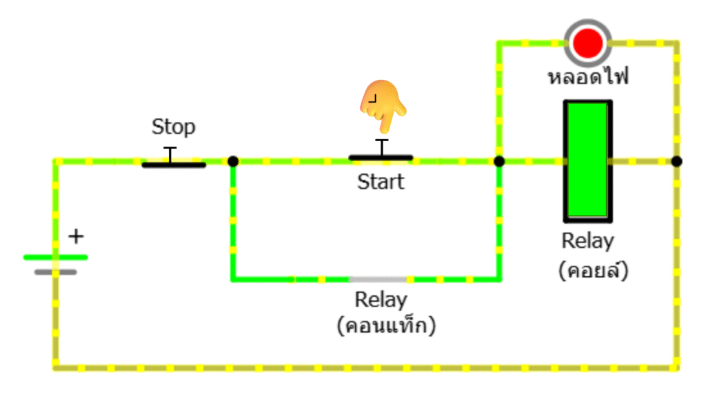 2. กดปุ่ม Start → กระแสไฟเข้าคอยล์รีเลย์ → หลอดไฟติด → รีเลย์ดึงคอนแทคให้ปิดวงจรด้วย