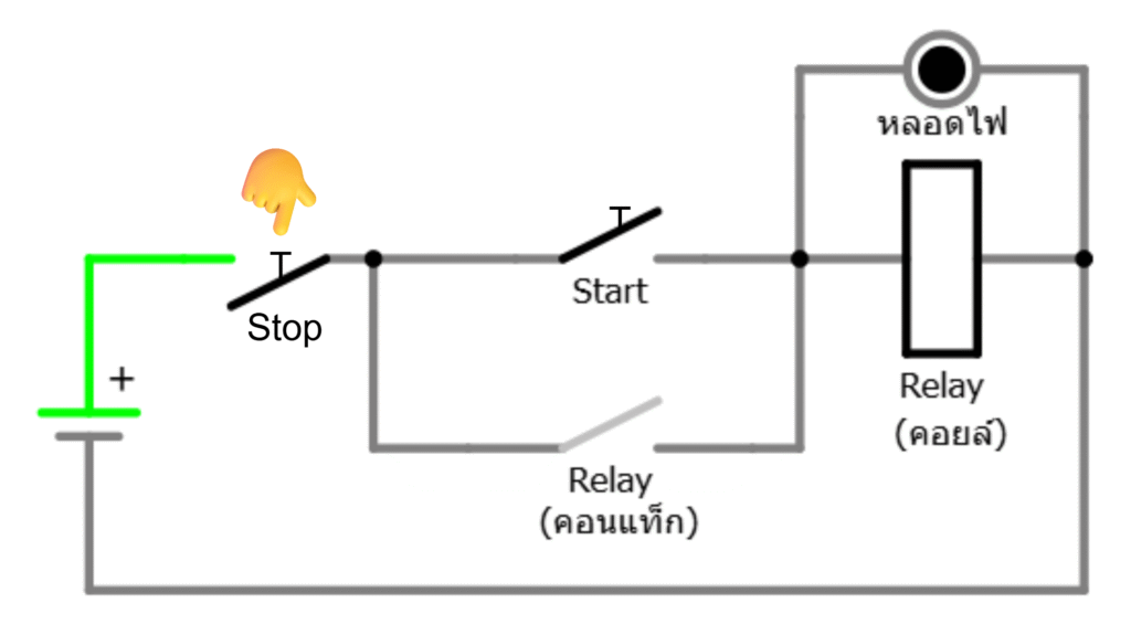 4. กดปุ่ม Stop (คอนแทค B) → ตัดไฟเข้าคอยล์ → คอนแท็กรีเลย์ปล่อย → หลอดไฟดับ