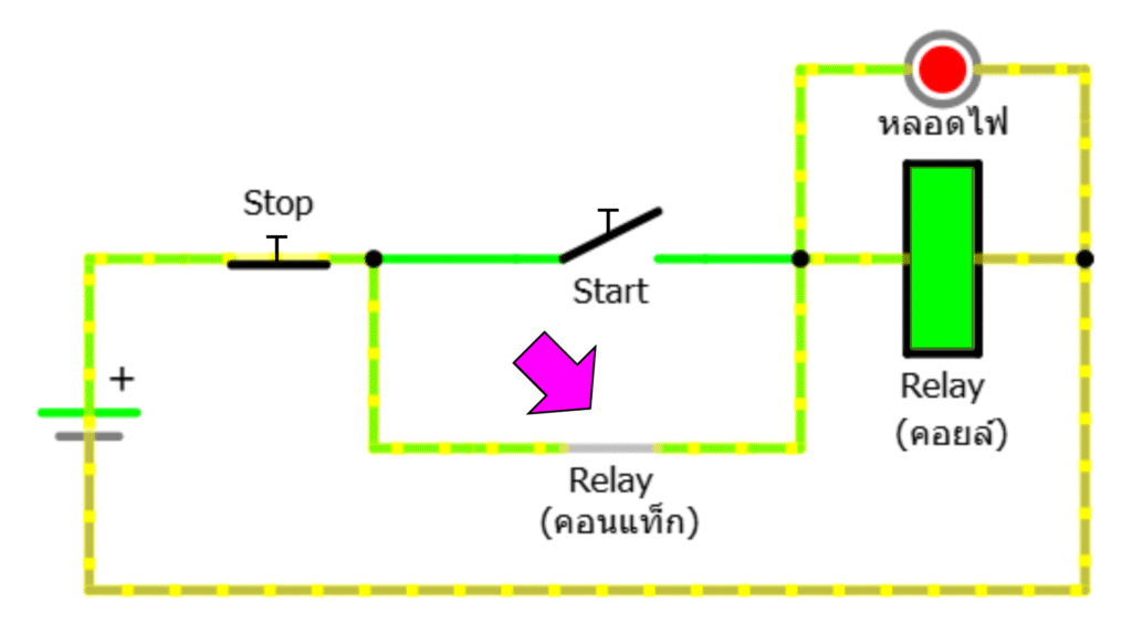 - วงจรยึดตัวเอง = ทำให้เครื่องยังทำงานต่อแม้ปล่อยปุ่มสตาร์ท